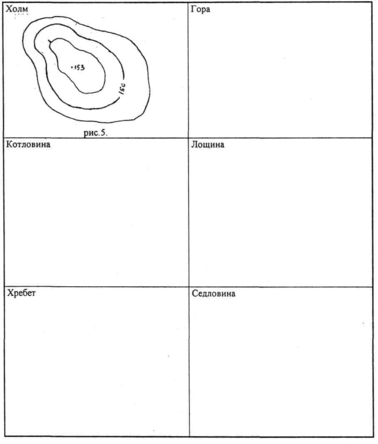 Найдите на карте пять основных форм рельефа. Скопируйте по каждой форме одну наиболее характерную. Подпишите в соответствии с правилами высоты горизонталей, поставьте скат штрихи. Проведите характерные линии рельефа (линии водотока и водораздела).