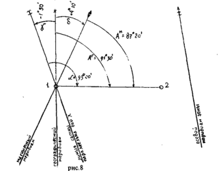 Указания к выполнению. Для измерения географического азимута надо через точку 1 провести географический меридиан. Если лист карты неполный, то надо параллельно перенести в т. 1 линию рамки (это истинный, географический меридиан). Точно так же перенести в т. 1 линию, параллельную координатной сетке.