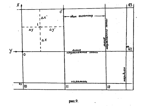 Прямоугольные координаты точек определяют относительно километровой координатной сетки, представляющих собой систему линий, параллельных координатным осям зоны, образующих систему квадратов. Выходы линий координатной сетки (сторон квадратов) подписаны в рамке карты в километрах.