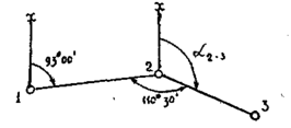 Первым дирекционным углом, подлежащим вычислению будет L2-3 .Тогда L2-3 = L1-2+180-B2 . Дирекционный угол линии 1-2 (см. рис.6) получили равный L1-2= 930 00', горизонтальный угол на т.2 (см. рис.5) получили равным В2= 110° 30', и графическая иллюстрация задачи имеет вид:
