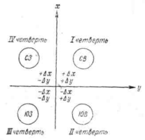 Знак приращения зависит от названия координатной четверти, в которой направлена данная сторона хода, и определяется по схеме (Рисунок 27.).
