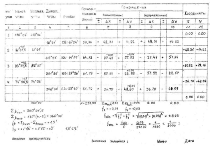 Вычисленные приращения округляются до сантиметров и вписываются в графу “Приращения вычисленные”.