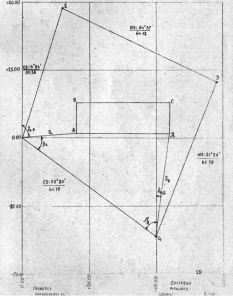 Вычисленные значения расстояний и углов используем для составления разбивочного чертежа.