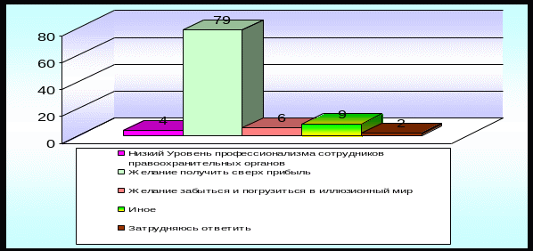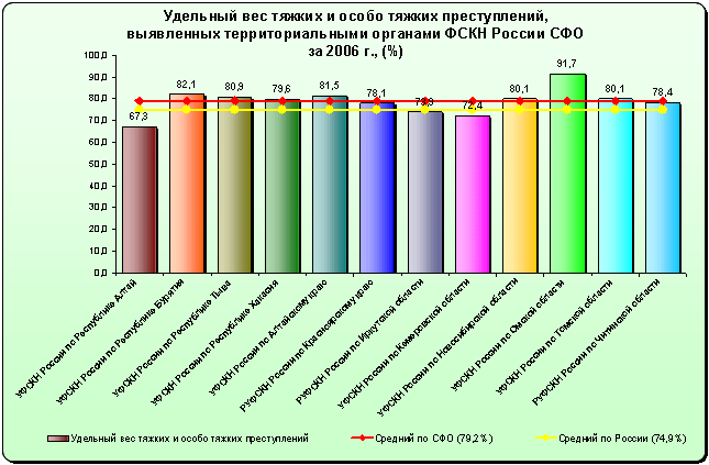 Сравнивая мнения сотрудников правоохранительных органов г. Новокузнецка с официальными данными органов ФСКН России Сибирского федерального округа, можно сказать, что, отметив средний процент раскрываемости преступлений в сфере незаконного оборота наркотических средств, они оказались правы. За 2006 год территориальными органами ФСКН России округа зарегистрировано 14 974 преступления, отнесенного к компетенции органов наркоконтроля (или 16,1% от ФСКН России). Из зарегистрированных преступлений 11 861 относится к тяжкой и особо тяжкой категориям, а их удельный вес составил 79,2%. (ФСКН России – 74,9%). Наиболее высокий удельный вес преступлений таких категорий в управлениях по Омской области, Республике Бурятия и Алтайском крае9.