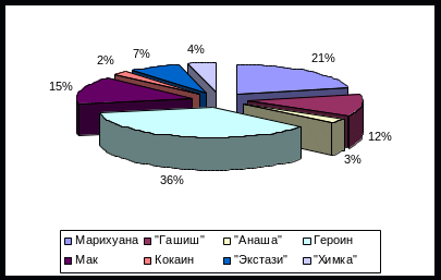 По данным диаграммы видно, что в Кузбассе широкое хождение имеют наркотики опийной группы и каннабисной (производные конопли), а внутри данных групп, большее распространение в криминальном обороте получили: