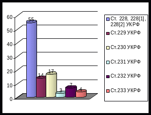 Как видно из диаграммы, основную массу преступлений изучаемой категории составляют незаконное приобретение, хранение, перевозка, изготовление, переработка, производство, сбыт или пересылка, а также нарушение правил оборота наркотических средств или психотропных веществ.