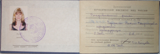 Осмотром установлено: снятие копии внутренней стороны обложки и первой страницы зачетной книжки, под номером 96, с печатью принадлежащей юридическому институту, факультет юридический.