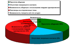 Практически равные значения заняли – простота общения и возможность общаться одновременно с несколькими людьми - действительно это главнейшие характеристики всего электронного общения, где «ойкумена» с её огромными пространствами средствами Интернета превращается в «большую деревню». Отсутствие визуального контакта и возможности говорить все, что угодно, а так же разговоры на актуальные темы – всё это звенья одной цепи – психологии личности в Интернете, ведь все эти показатели говорят о невозможности, неспособности показать своё я в реальной жизни.