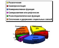 Развлечения, как наиболее востребованная часть блогосферы занимает первое место, вероятно большая часть пользователей воспринимает ведение сетевого дневника, как способ разнообразно и интересно провести досуг. Функция мемуаров – свидетельствует о том, что реализуется потребность человека в выражении своих взглядов, впечатлений, сиюминутных эмоций. Сплочение и удержание соц., связей не является приоритетной, так как общий функционал блогосферы отличен от соц., сетей, которые предназначены для этого, в блогосфере это своего рода кружок по интересам. Функции: психотерапевтическая, саморазвития или рефлексии не занимают первых позиций, они между тем проистекают латентно (скрыто, сами по себе).