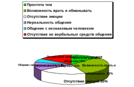 Возможность «врать и обманывать», а так же не реальность общения, простота тем, общение с незнакомым человеком – это показатели не доверия к общению в Интернете. Отсутствие эмоций и невербальных средств общения, - это оценка качества общения. В целом негативные характеристики проранжированны респондентами, характерны для всего общения в Интернете.