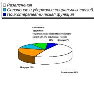 Сплочение и удержание социальных связей – это бесспорно центральная функция соц.,сетей - желание встретить давно забытых друзей. Развлечение - реализация потребности в разнообразие досуга и в этом помогают новые развлекательные сервисы, существующие и вводимые в соц., сетях.