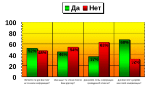 С одной стороны, для данной целевой группы – блоги источник информации и средство массовой информации, но с другой присутствует скепсис к информации, изложенной в блогах, так же чтение блогов не обогащает кругозор. Такой дуализм легко объясним сегодняшним уровнем развития блогосферы, где она примерно укладывается в текущую функциональность СМИ. Но не профессиональность сетевой журналистики, ведёт к недоверию информации приведённой в блогах.