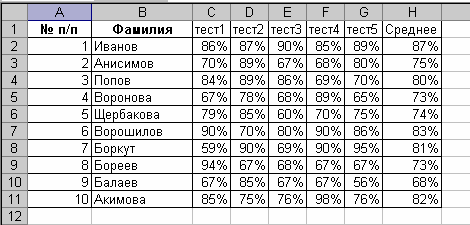 Выделите диапазоны данных, содержащие фамилии студентов и средние показатели тестирования. В нашем случае это несмежные диапазоны ячеек B1:B11 и H1:H11. Для выделения несмежных диапазонов выделите сначала первый диапазон, затем нажмите на клавиатуре кнопку Ctrl и, удерживая ее, выделите второй из несмежных диапазонов.