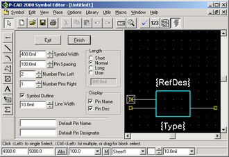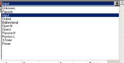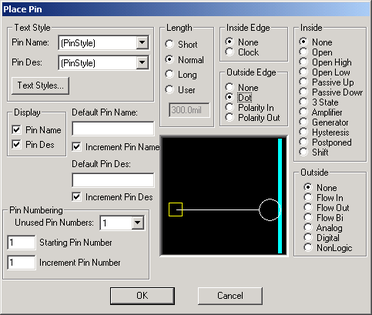 Здесь мы задаем Высоту и ширину элемента, количество входящих и выходящих ножек, их дину(Short, Normal, Long и т.д.) Для вставки текста войдем в меню Place/Text и разместим нужный текст. Для создания элементов НЕ, триггеров и т.д. рисуем ножку сами. Войдем в меню Place/Pin, где выбираем необходимый вид (рис. 19) После окончания нажимаем кнопку Finish. Перед нами появится уже знакомое нам диалоговое окно (Рис.16), где мы аналогично, как и в Pattern Editor сохраняем элемент.