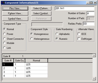 В команде Numeric of Pins указываем количество ножек-14, в команде Numeric of Gates указываем количество элементов в блоке-4, в команде Refdes of Prefix указываем обозначение элемента на схемах-DD.Т. к. в блоке все создаваемые нами компоненты одинаковы, то в команде Component Style ставим Homogenos, в команде Gate Numbering ставим Numeric, для того, чтобы элементы нумеровались.