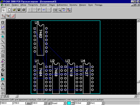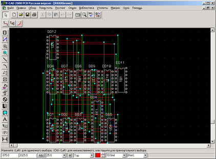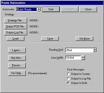 Таким образом, мы подготовили печатную плату к автоматической трассировке. В меню Роутинг выбираем команду Автороутеры…, в появившемся диалоговом окне (рис.10) выбираем тип автотрассировщика Quick Route. Это самый простой из трассировщиков, входящих в состав пакета Р-CAD 2000, он используется лишь для разводки несложных плат, содержащих небольшое количество компонентов, и для профессиональной разводки не рекомендуется. Нажимаем кнопку Start и на рабочем поле редактора РСВ появляется уже разведенная печатная плата. Автоматически изменяется и имя файла, в начале добавляется префикс R. Теперь наш файл н