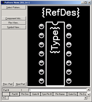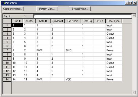 В Pad# и Pin Des нумеруем по порядку. В Gate# ставим номер блока, соответствующий данной ножке. Как видно всего 4 элемента и у каждого и по 3 ножки. Входы 7 и 14 служат для питания, поэтому они и обозначаются соответственно. В Sym Pin# в соответствии со справочником расставляется нумерация ножек. В Pin Name ставятся обозначения (для элементов питания, триггеров и т.д.) В Gate Eq в верхней строке ставим 1 и опускаемся вниз, на всех ножках элементов она проставится самостоятельно. В Elec. Type указываем электрический тип ножки (Input-входная, Output-выходная, Power - питание и т.д.)