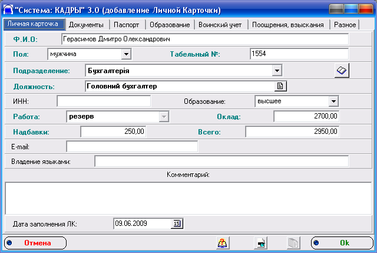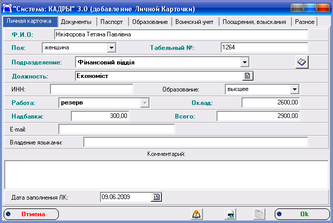 бажані (паспортні дані, освіта, військовий облік, заохочення, стягнення, сумісниця і стаж роботи, пільги, при необхідності - інвалідність) відповідно на вкладках "Паспорт", "Образование", "Воинский учет", "Поощрения, взыскания", "Разное".