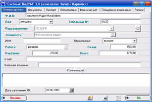обов'язкові (прізвище ім'я по батькові, стать, табельний номер, підрозділ, посада, оклад володіння язиками, e-mail співробітника) на вкладці «Личная карточка» і