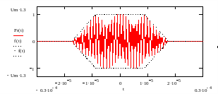 Подставляя численное значение частоты несущего высокочастотного колебания (f0=918,9 кГц), в (3.9) построим график радиосигнала рисунок 3.6.