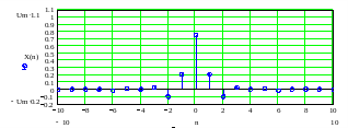 Согласно выражениям (3.8) и (3.9) периодический сигнал состоит из суммы бесконечного числа гармонических колебаний кратных частот (гармоник), вклад которых в общую сумму определяется весовыми коэффициентами X[n]. Таким образом, являясь амплитудами дискретных частотных компонентов (гармоник) составляющих данный сигнал, коэффициенты X[n] образуют дискретный спектр периодического сигнала рисунок 3.4. «Востановленный» с помощью ряда Фурье сигнал, при суммировании десяти первых гармоник, приведен на рис 3.5.
