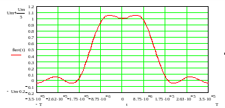 Данный ряд называется рядом Котельникова и позволяет полностью восстановить аналоговый сигнал fa(t) из дискретных выборок этого сигнала, если сигнал fa(t) имеет ограниченный спектр с максимальной частотой fg, и если выборки взяты с частотой не меньшей 2fg. Поскольку сигнал, подвергнутый дискретизации (3.2), имеет неограниченный спектр (3.5), то восстановление сигнала (3.26) по его выборкам (3.23), будет неточным. Уменьшить ошибку до любого уровня можно увеличивая частоту дискретизации. Сигнал восстановленный с помощью выражения (3.26), приведен на рисунок 3.11.
