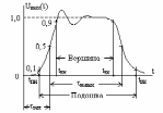 Для измерения параметров выходного импульса напомним соглашение, известное из курса электроники (см. рис. 4). Здесь введены понятия вершины и подошвы импульса. Вершина ограничена точками времени tвн (начало вершины) и tвк (конец вершины), которые определены моментами пересечения исследуемой кривой уровня 0.9Uвых,уст. Аналогичным образом по пересечениям уровня 0,1Uвых,уст определяются моменты времени tпн и tпк, определяющие длительность подошвы импульса пш. Через эти моменты естественным образом могут быть выражены интервалы времени запаздывания зап, длительности фронта ф, спада сп и длительности самого импульса и,вых.