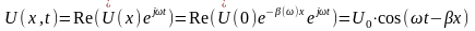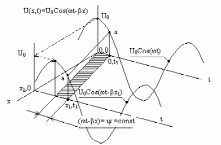 В правой части этого равенства стоит функция времени и длины отрезка линии. Это гармоника той же амплитуды, что и на входе линии, поскольку затухания нет. Аргумент этой функции (t‑x) в теории длинных линий принято называть «полной фазой». Видно, что для одного и того же момента времени t значение U (x, t) различно для различных точек по длине линии, и мера этого различия определяется значением величины на данной частоте.