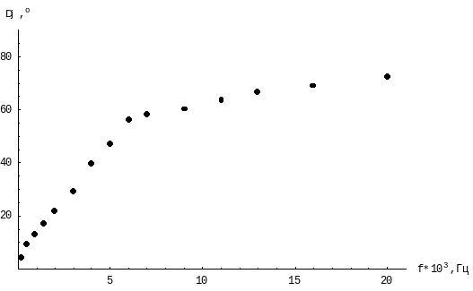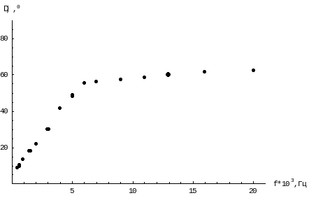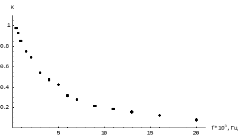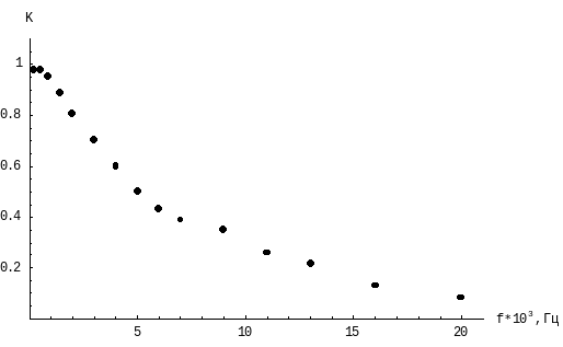 | f,Гц*103 | 0,2 | 0,5 | 0,9 | 1,4 | 2 | 3 | 4 | 5 | 6 | 7 | 9 | 11 | 13 | 16 | 20 |