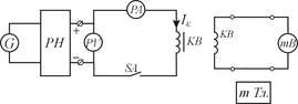 На рис.5.7. наведена електрична схема установки. Вона складається із джерела живлення постійного струму G, регулятора напруги РН, котушки збудження електромагніта К3, вимикача SA, амперметра РА і вольтметра PV. Вимірювана котушка КВ під’єднана до мілівеберметра mB.