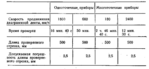 При проверке погрешности на скоростях, отличающихся от указанных в таблице 13, время проверки должно быть выбрано таким, чтобы расчетная длина отрезка диаграммной ленты была не менее 500 мм, а для скорости 54000 мм/ч— 4500 мм.