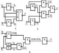 Структурные схемы, составленные по формулам (2), (5) и (6), приведены на рис. 10. Видим, что после минимизации для реализации функции требуется меньшее число логических элементов.