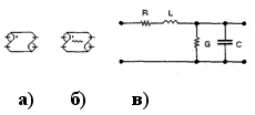 Линии связи (ЛС) могут быть представлены двумя моделями: идеальной двухпроводной ЛС без потерь (рис. 1, а) и с потерями (рис. 1, б). Математическая модель ЛС с потерями состоит из набора одинаковых звеньев (сегментов), схема которого (рис. 1, в) содержит (в обозначениях EWB 5.0):
