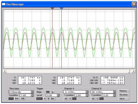 Из осциллограмм на рис. 5, полученных в результате моделирования, можно определить запаздывание α выходного сигнала относительно входного на длину линии в режиме бегущей волны ( α = 2πf(Т2-Т1)), а из индикаторных окон – амплитуды входного Uim=VA1 и выходного Uom=VB2 напряжений.
