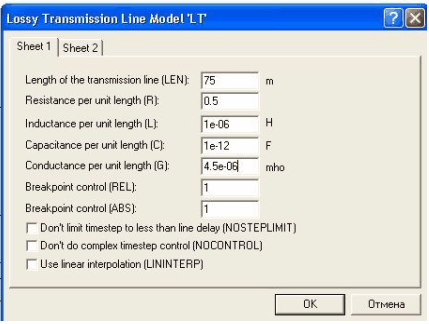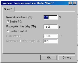 В окне, изображенном на рис. 2, задаются значения параметров эквивалентной схемы (рис.1,в), где, кроме перечисленных выше параметров, указаны длина ЛС (LEN , м). В диалоговом окне для идеальной ЛС (R = 0, G = 0) (рис. 3) обозначено: ZO -волновое сопротивление, Ом; TD — время задержки распространения сигнала. Процессы, происходящие в ЛС, описываются так называемыми телеграфными уравнениями [51]: