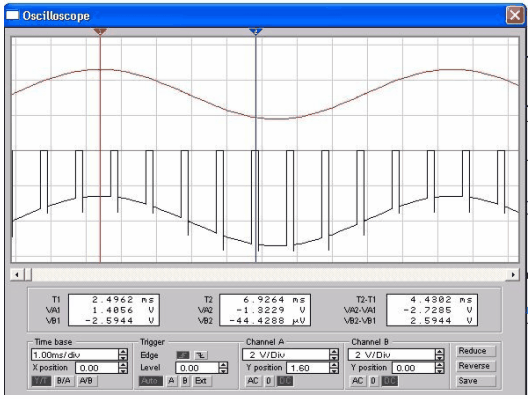 Сигнал с выхода колебательного контура измеряется осциллографом и подается на вход амплитудного детектора, формирующего модулирующее (низкочастотное) колебание, которое также можно наблюдать на экране (Рис.10) осциллографа по каналу В.