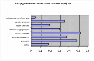 Наибольшей степенью различия (дифференциация) между марками шампуня для потребителей обладает такой атрибут как: густота шампуня (0.52), пенность (0.48), наличие витаминов (0.37), дизайн упаковки (0.35), наличие кондиционеров (0.30). Наименьшей степенью различия обладают такие атрибуты, как: объем упаковки (0.19), запах (0.18), добавление целебных трав (0.04). Распределение ответов на рис.1.2.