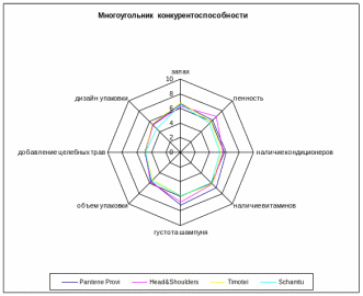 Исследуемая марка шампуня Pantene Provi в целом занимает лидирующую позицию по отношению потребителей к данной марки шампуня. Наиболее слабыми показателями данной марки шампуня можно назвать пенность и запах, но следует обратить на них внимание, так как эти атрибуты являются наиболее важными при выборе шампуня. Хотя по таким показателям как наличие витаминов, наличие кондиционеров, густота шампуня, добавление целебных трав была оценена достаточно высоко, следует эффективно управлять этими атрибутами при продвижении шампуня. Многоугольник конкурентоспособности на рис.1.4.