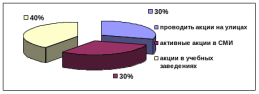 Согласно проведенному опросу, большинство считают, что в школах г. Братска отводится недостаточное внимание освещению проблемы наркомании – 60%, и 40% респондентов дали положительный ответ. Так же большинство опрошенных (64%) считают, что уровень информатизации населения по проблеме наркомании – низкий, а 33% полагают, что средний, и лишь 3% признают его высоким. По их мнению, для его увеличения необходимо проводить акции, направленные «против наркотиков» начиная со школ и учебных заведений (40%), а по 30% считают, что для этого нужно проводить акции на «улицах» и в СМИ.