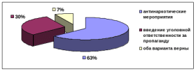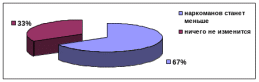 По данным анкетирования было установлено, что в случае введения уголовной ответственности за пропаганду наркотиков в любой форме наркоманов станет меньше – 67%, но 33% опрашиваемых убеждены, что ни чего не изменится.