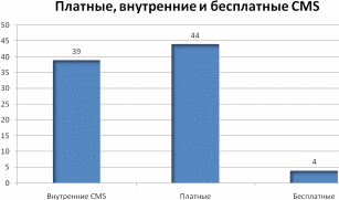 Видно (рис. 1), что предпочтение разработчики чаще всего отдают не общедоступным CMS. Это наблюдается из-за того, что качество и функциональность свободных CMS значительно ниже платных либо разработанных собственными силами.