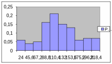 Составляем таблицу частот группированной выборки (табл. 2), содержащую столбцы с номерами интервала i, значениями нижней границы (начала интервала) и представителя интервала
