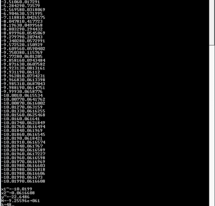 // if (y1 // else a=x1; return ( (a+b) /2); } void main () {int k, i,N,N0,N1,l1,l2; double a,b,d,ymin,xmin1,xmin2,e2,dalph; double x [3000] [2]; double y [10]; clrscr (); x [0] [1] =-1; x [0] [2] =0; e2=0.0001; double z1,z2,y1,y2,e,p,alpmin,g1,g2; int m; cout<<"Metod naiskor. spuska"< k=0; N0=0; N1=0; z1=df1 (x [0] [1],x [0] [2]); z2=df2 (x [0] [1],x [0] [2]); N1=N1+2; dalph=2.2; mm1: m = 0; y1=f (x [k] [1],x [k] [2]); N0++; metka: y2=f (x [k] [1] - (m+1) *dalph*z1,x [k] [2] - (m+1) *dalph*z2); N0++; if (y2 {m++; y1=y2; goto metka; } else {b= (m+1) *dalph; if (m==0) {a=0; } else {a= (m-1) *dalph; } } alpmin=zsech (a,b,x [k] [1],x [k] [2],z1,z2); cout<<"\nk="< x [k+1] [1] =x [k] [1] - alpmin*z1; cout<<"\nx [1] [1] ="< x [k+1] [2] =x [k] [2] - alpmin*z2; cout<<"\nx [1] [2] ="< z1=df1 (x [k+1] [1],x [k+1] [2]); z2=df2 (x [k+1] [1],x [k+1] [2]); N1=N1+2; d=pow (z1*z1+z2*z2,0.5); if (d>e2) {k++; goto mm1; } else {xmin1=x [k+1] [1]; xmin2=x [k+1] [2]; ymin=f (xmin1,xmin2); cout<<"x1="< #include #include #include #include "iomanip" #include using namespace std; int N0=0, N1=0; double a=3, b=-1.2, c=0.02, d=1.3; double f (double x1, double x2) { double f; N0++; f=3*x1-1.2*x2+exp (0.02*x1*x1+1.3*x2*x2); return (f); } double fdx1 (double x1,double x2) {double fx1; N1++; fx1=3+0.04*x1*exp (0.02*x1*x1+1.3*x2*x2); return (fx1); } double fdx2 (double x1,double x2) { double fx2; N1++; fx2=-1.2+2.6*x2*exp (0.02*x1*x1+1.3*x2*x2); return (fx2); } void evrist () { double x1 [100],x2 [100],A1,A2,E2,del1,del2,f1,f2,h [4],g [4],b [4],r [4]; double d,N; int k; x1 [0] =-1; x2 [0] =0; E2=0.0001; del1=0.01; del2=3; A1=0.5; A2=2; k=0; label1: do{ h [1] =fdx1 (x1 [k],x2 [k]); if (fabs (h [1]) >del1) {g [1] =h [1]; } else {g [1] =0; } h [2] =fdx2 (x1 [k],x2 [k]); if (fabs (h [2]) >del1) {g [2] =h [2]; } else {g [2] =0; } x1 [k+1] =x1 [k] - A1*g [1]; x2 [k+1] =x2 [k] - A1*g [2]; // cout<<":: "< f1=f (x1 [k+1],x2 [k+1]); f2=f (x1 [k],x2 [k]); k++; } while (f1 k--; do{ r [1] =fdx1 (x1 [k],x2 [k]); if (fabs (r [1]) >del2) {b [1] =0; } else {b [1] =r [1]; } r [2] =fdx2 (x1 [k],x2 [k]); if (fabs (r [2]) >del2) {b [2] =0; } else {b [2] =r [2]; } x1 [k+1] =x1 [k] - A2*b [1]; x2 [k+1] =x2 [k] - A2*b [2]; cout< f1=f (x1 [k+1],x2 [k+1]); f2=f (x1 [k],x2 [k]); k++; }while (f1 k--; d=pow (r [1],2) +pow (r [2],2); if (sqrt (d) >E2) {A1=A1/2.0; A2=A2/2.0; goto label1; } else {cout<<"X1="< N=N1+N0; cout<<"Кол-во экспер.: "< N0=0; N1=0; } void main () { evrist (); getch (); } Скрин до методу 1