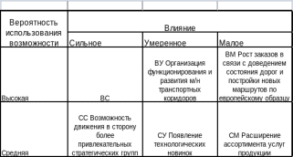 Для оценки возможностей применяется метод позиционирования каждой конкретной возможности на матрице возможностей (рис.2.2). Матрица строится следующим образом: сверху по горизонтали откладывается степень влияния возможности на деятельность организации (сильное, умеренное, малое); слева по вертикали откладывается вероятность того, что организация сможет воспользоваться возможностью (высокая, средняя, низкая). Полученные внутри матрицы девять полей возможностей имеют разное значение для организации. Возможности, попадающие на поля ВС, ВУ и СС (родственная диверсификация, возможность движению в сторону более привлекательных стратегических групп), имеют большое значение для организации, и их надо обязательно использовать. Возможности же, попадающие на поля СМ, НУ и НМ, практически не заслуживают внимания организации. Использовать возможности, попавшие на оставшиеся поля, можно, если у организации имеется достаточно ресурсов.