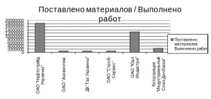 Анализируя поставщиков материалов для ОАО «Трест «Донбассдорстрой» (Приложение Г – Оборотно-сальдовая ведомость по счёту 631) за последние 9 месяцев 2008 года можно выделить поставки основных материалов. Дизтоплива и битума было получено от ОАО «Нафтотрейд Украины» на сумму 18223089,62 грн. ОАО «Азовинтекс» поставило щебня на 667670,00 грн. ДК «Газ Украины» поставило газа природного на сумму 737119,95 грн., ОАО «Строй-Сервис» поставило материалов на 709412,23 грн. ОАО «Юрт0Ындастри» было выполнено работ на 12903938,40 грн., Корпорацией «Индустриаьный Союз Донбасса» было выполнено работ на 2586567,37 грн. (рис 1.2).