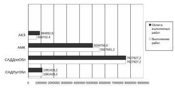 За 9 месяцев текущего года по договорам со Службой автомобильных дорог в Донецкой Области было выполнено работ и оплачено на сумму 7627627,20 грн.; по договорам со Службой автомобильных дорог в Луганской Области – на сумму 1081429,40 грн. Для ОАО «Алчевский металлургический комбинат» было выполнено работ на 5567691,20 грн., из них оплачено 5084754,60 грн. Для ОАО «Алчевский коксохим завод» в 2008 году было выполнено работ на сумму 659702,40 грн., а оплачено 884992,80 грн., с учётом выполненных, но неоплаченных работ в 2007 году. Детальнее можно рассмотреть выполненные и оплаченные работы работы по ОАО «Трест «Донбассдорстрой» по заказчикам можно в Приложении В (Оборотно-сальдовая ведомость по счёту 361), а также на Рисунке 1.1