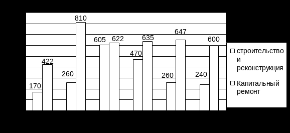Рисунок 2.1 – Объёмы капитального ремонта, строительства и реконструкции автомобильных дорог 2006-2011 гг.
