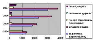 Розглядаючи діаграму можна побачити, що найбільше фінансування наукових та науково-технічних робіт залежить від власних коштів, найбільше було профінансовано у 2007 році у розмірі 3788,2 грн., також можна побачити, що немалу роль відіграє фінансування з держбюджету. Можна прослідкувати те, що з кожним роком фінансування наукових та науково-технічних робіт збільшується, це є добрим показником, оскільки інноваційна діяльність стає більш розвиненою.