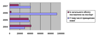 Аналізуючи, ми бачимо, у 2004-2005 році обсяг продукції який був поставлений на експорт і нова продукція майже не змінювалася і був майже рівний між собою. Найбільше було реалізовано нової продукції у 2006 році і її обсяг становив 92333,2 тис. грн, а також обсяг поставленої продукції на експорт у цьому ж році становив лише 2949,2 тис. грн. найменше протягом 2004-2007 років. Із-за того, що у 2006 році ринок був преповнений товарами, ми бачимо, що у 2007 році обсяг реалізованої продукції зменшився, а обсяг експорт зріс до 17325,7 тис.грн., що на 14376,5 тис. грн. більше, ніж у 2006 році.