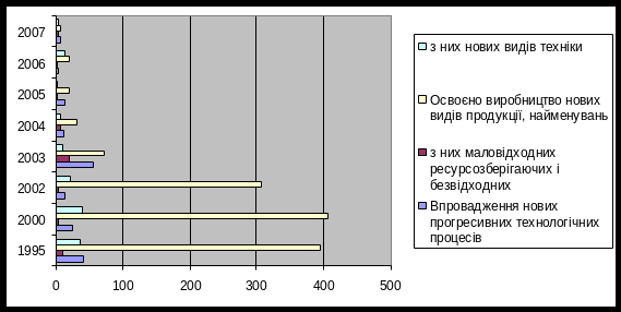 Розглядаючи діаграму зробили висновки, що найбільше освоювались нові види продукції у 1995-2002рр., починаючи з 2003 року спостерігається тенденція спадання. Також можна сказати, що впровадження прогресивних технологічних процесів та освоєння виробництва нових видів продукції у промисловості з кожним роком зменшується, це є поганим фактором для розвитку інновацій, тому, що з поменшанням використання нових прогресивних технологій виробництво країни буде занепадати, оскільки без інновацій неможливий економічний розвиток країни в цілому.